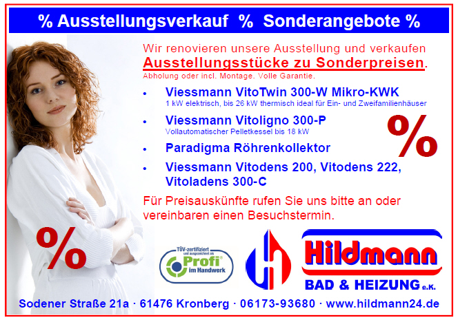 Ist Ihre Heizung älter als 17 Jahre oder planen Sie dieses Jahr Ihre Heizungssanierung? Wenn ja, dann möchten wir Sie gerne zu unserem 5. Infoabend „Ihre neue Heizung, zukunftssicher und sparsam“ einladen. Wir informieren Sie umfassend, mit welcher Heizung und welcher Energieart Sie in Zukunft Ihre Energiekosten senken und bares Geld sparen. Einladung zu unserem 5. Info-Abend: Ihre neue Heizung, zukunftssicher und sparsam! Termin: Mittwoch , 02. März 2011, 18.30 Uhr bis ca. 20.00* Uhr Ort: Sodener Straße 21a, 61476 Kronberg. Um Anmeldung wird bis zum 01.03.11 gebeten.