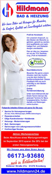 Hildmann ist Ihr Partner vor Ort für professionelle Bad- und Heizungslösungen. Und im September 2015 bieten wir Ihnen beim Abschluss eines Wartungsvertrages eine Ersparnis von 20% bei der ersten Heizungswartung. Als zertifizierter „Profi im Handwerk“ werden wir täglich unserem Anspruch, zu den Besten der Branche zu gehören, gerecht. Eine effiziente Qualitätskontrolle, bei der gerade unsere Kunden ein Wörtchen mitzureden haben, gehört ebenso dazu wie der Service „Direkt-Termin“, unserem zuverlässigen System für Online-Terminvereinbarungen. Überzeugen Sie sich von unseren Leistungen. Und übrigens: Unsere Preisaktion für den BWT-Einhebelfilter E1 plus geht bald zu Ende. Noch bis Ende August erhalten Sie den Einhebelfilter plus Einbau von den Hildmann-Profis zum Sonderpreis. Für weitere Informationen zur Sonderaktion BWT E1 plus und zur September-Aktion Wartungsvertrag rufen Sie einfach an unter: 0 61 73 – 9 36 80. Wir freuen uns auf Ihren Anruf! |