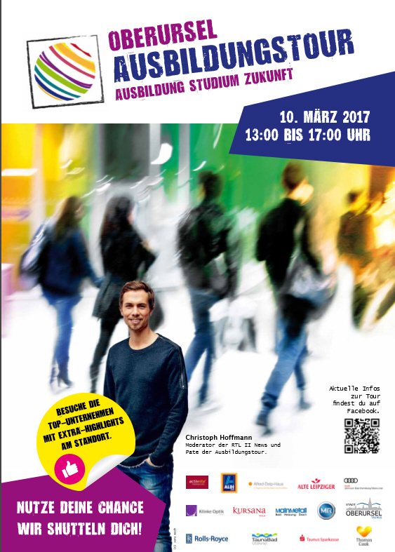 Warum in die Ferne schweifen, wenn die besten Ausbildungs- und Karrierechancen direkt vor der eigenen Haustür warten? Bei der alljährlichen Oberursel Ausbildungstour am Freitag, 10. März präsentieren sich das Handwerk, viele namhafte Arbeitgeber sowie Schulen und Hochschulen aus der Region, um Schulabgänger über die verschiedenen Berufsmöglichkeiten und Perspektiven zu informieren und Orientierung bei der Berufswahl zu geben. Eine Vielzahl von Ausbildungsberufen und Studiengängen können dabei unter die Lupe genommen werden. Ob am eigenen Firmensitz oder zentral an der Hochtaunusschule - von 13 bis 17 Uhr stellen sich über 40 Arbeitgeber und Organisationen aus Oberursel und der Region im persönlichen Gespräch, an sogenannten Mitmach-Stationen oder Info-Ständen den Schülerinnen und Schülern vor, und beantworten alle Fragen rund um Job & Karriere. Ein kostenloser Shuttlebus kutschiert die Tour-Teilnehmer dabei von einem Unternehmen zum anderen. |